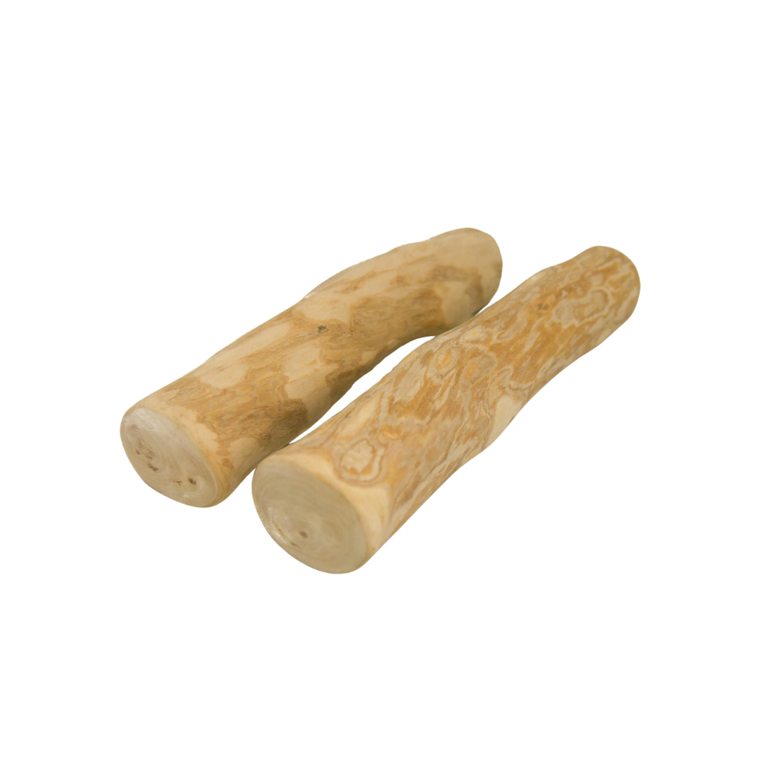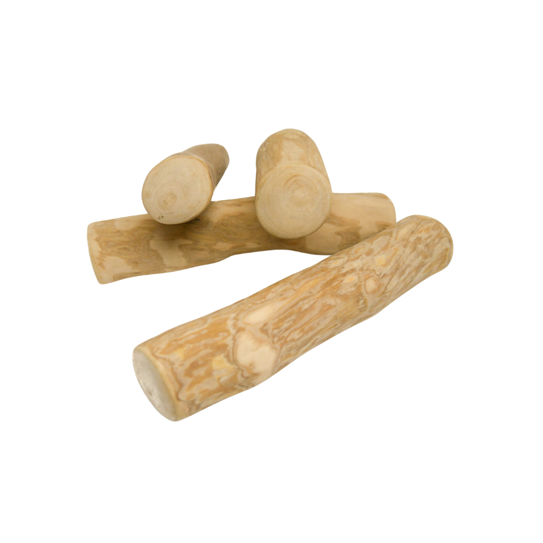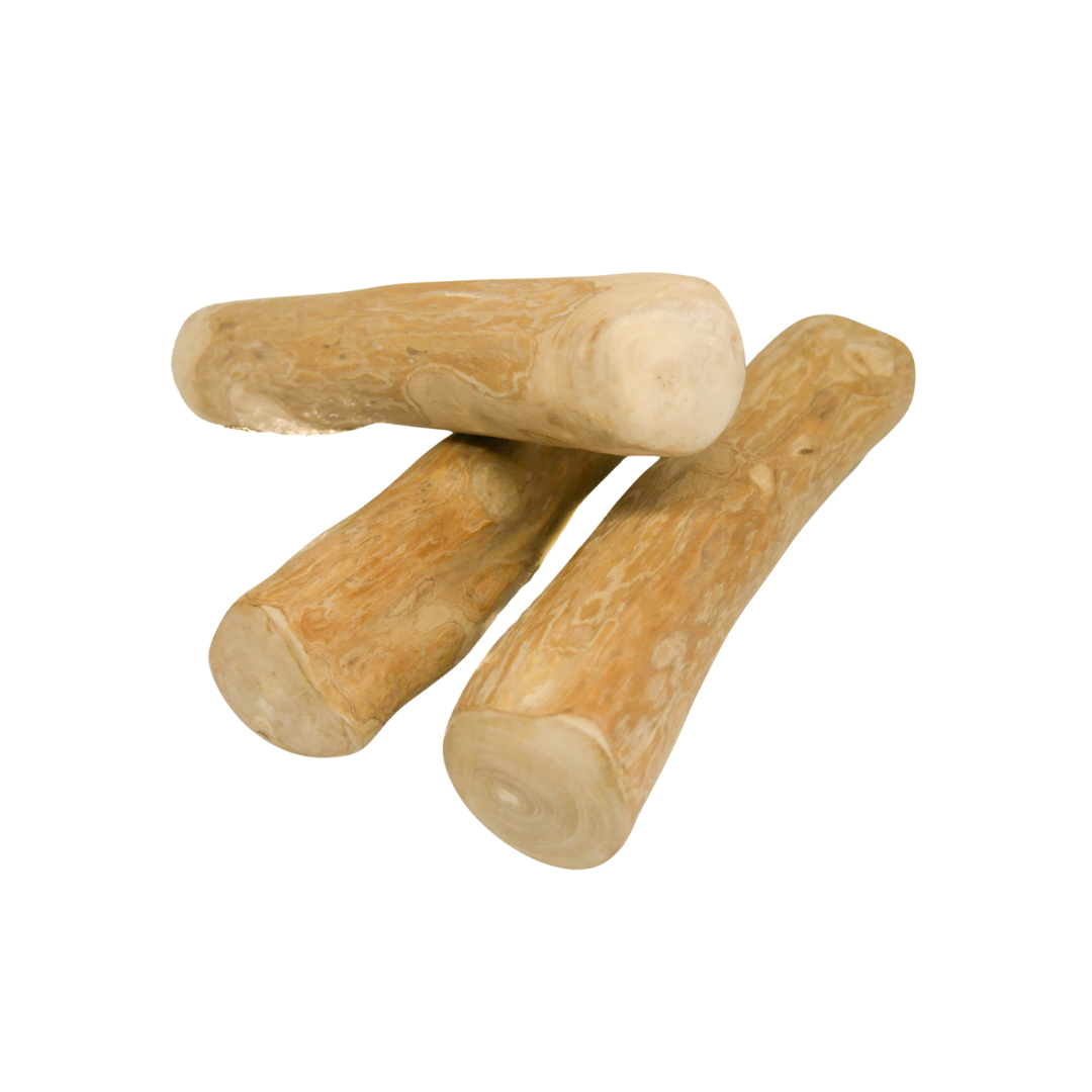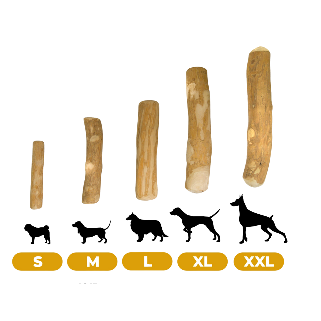 Coffee wood stick is a 100% natural dog chew. The chew is made of natural wood harvested from the coffee tree. After being harvested, the stick is cleaned and then dried. It is then cut into pieces of the appropriate length and sanded so that it is smooth and has no sharp edges. The individual fibers which, are torn off by the dog while chewing are safe for him and clean the spaces between the teeth nicely. The product contains no artificial additives. It leaves no residue and has basically no smell, but you can gently smell a wooden aroma. The stick is available in five sizes.