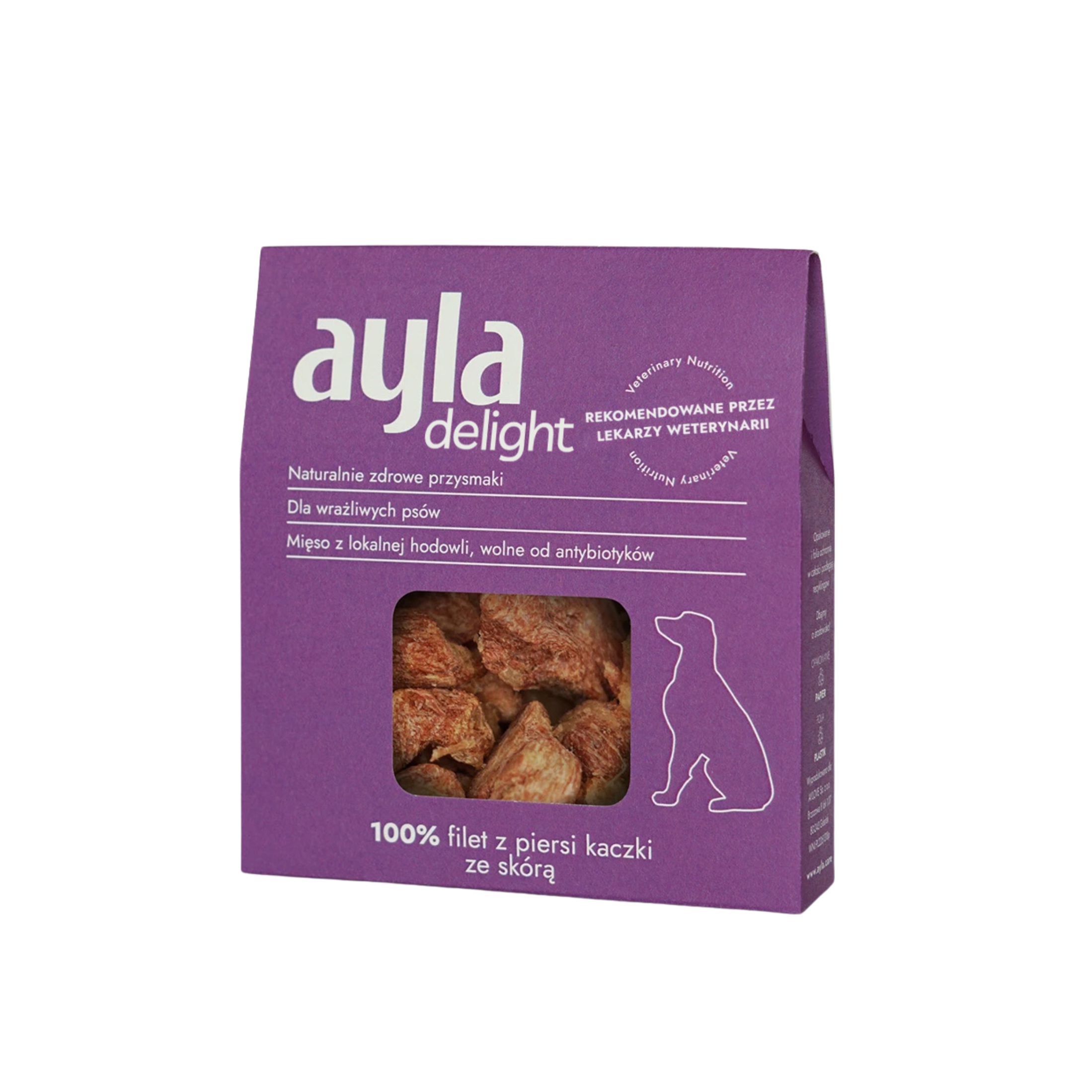 Freeze-dried duck breast fillet with skin is characterized by its high protein content. It is a source of unsaturated fatty acids, so beneficial for health, as well as micronutrients such as potassium, iron, phosphorus, magnesium and vitamin A and B vitamins, which contribute to proper metabolism and strengthening of the dog’s immunity. Freeze-dried pieces of meat are ideal as a snack or to add variety to a dog’s daily diet. They are also suitable for puppies. Ayla treats are recommended by veterinarians – the mono-protein formula is safe among dogs with sensitive digestive systems.