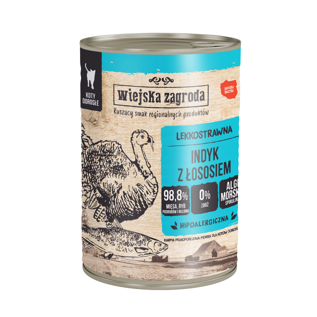 The basis of the meal is therefore a duo of carefully selected meat, fish and offal in an aromatic broth of its own. Turkey meat is easily digestible, lean, and at the same time rich in nutritious protein. In a duo with salmon – an invaluable source of Omega 3 and vitamin D acids, it makes a delicious and healthy meal.