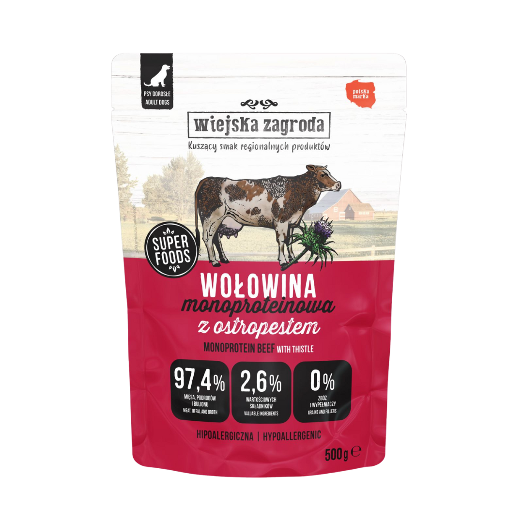 Wiejska Zagroda wet dog food – Beef with milk thistle is a daily portion of health and energy for your pet. The recipe based on beef and valuable superfoods is an ideal choice for active, picky dogs and those with the need to support liver function.