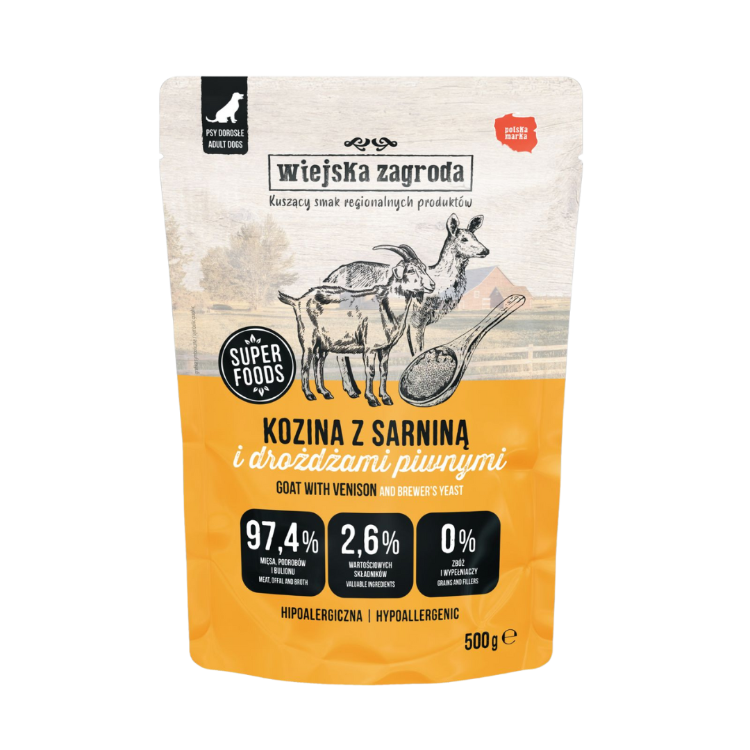 The Kozina Country Homestead with venison and brewer’s yeast is a unique proposition for demanding dogs, who appreciate a distinct taste and natural composition. It’s a daily portion of health enclosed in a convenient sachet.