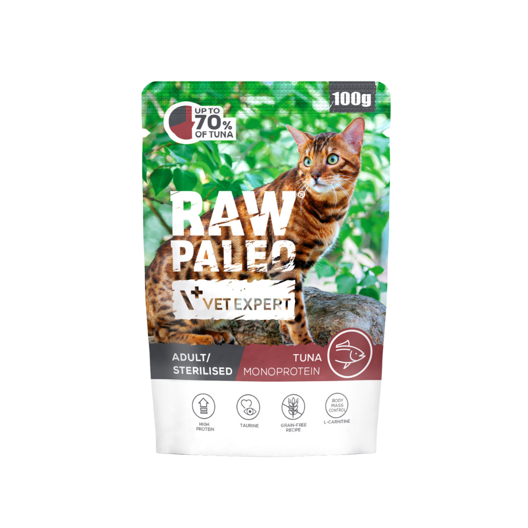 Monoprotein wet food with beef for adult cats. As much as 70% beef and offal in one sachet! RAW PALEO wet food for adult cats is a complete and balanced complete nutritional food for adult cats from the age of 1 year. The food is grain-free (Grain Free) and mono-protein, which means that all the animal ingredients used to make the food are derived from beef.