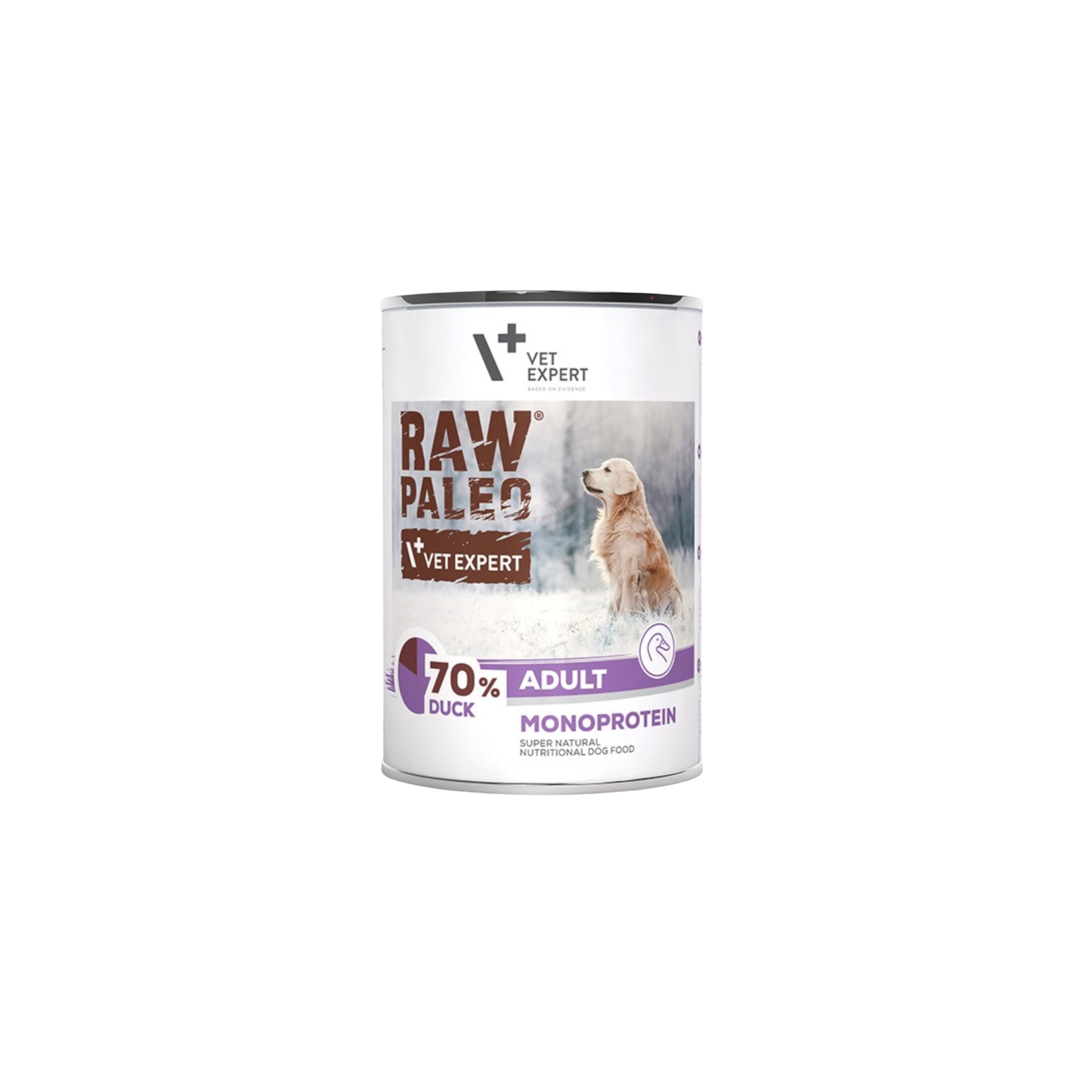 Raw Paleo Adult Duck is an exceptionally tasty wet food prepared with a duck base (70%).