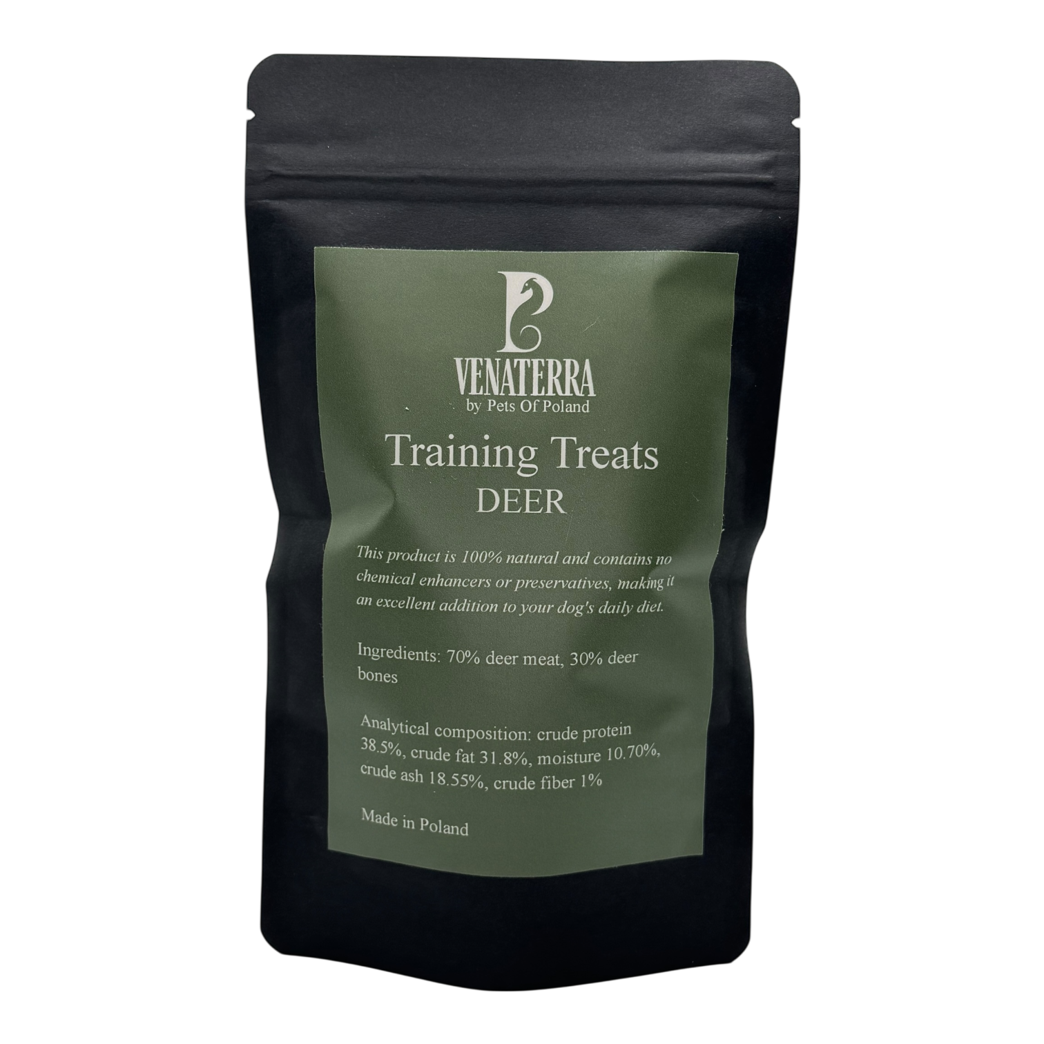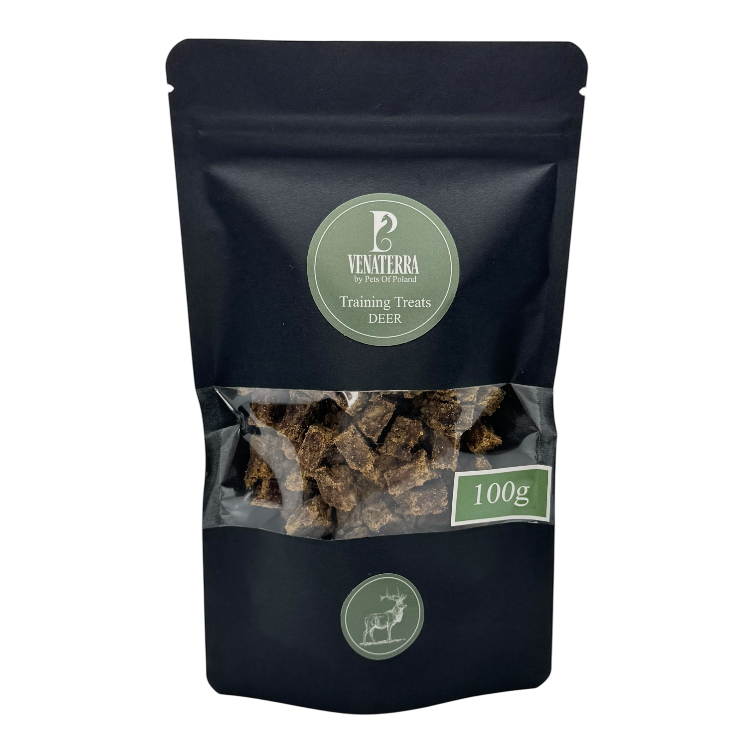 Venaterra Training Treats Deer to w 100% naturalne przysmaki treningowe z jelenia, stworzone z myślą o codziennym treningu, nagradzaniu i pracy z psem. Prosty skład, jedno źródło białka i brak jakichkolwiek dodatków chemicznych sprawiają, że są to trenerki odpowiednie także dla psów z alergiami i wrażliwym układem pokarmowym.