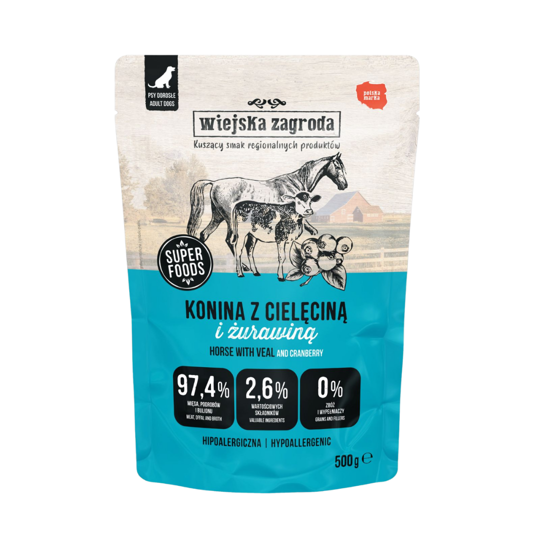 Wiejska Zagroda Konina z cielęciną i żurawiną to świadomy wybór dla opiekunów ceniących jakość, naturalne składniki i wyjątkowe receptury. Smaczna, zdrowa i stworzona z myślą o potrzebach Twojego psa!